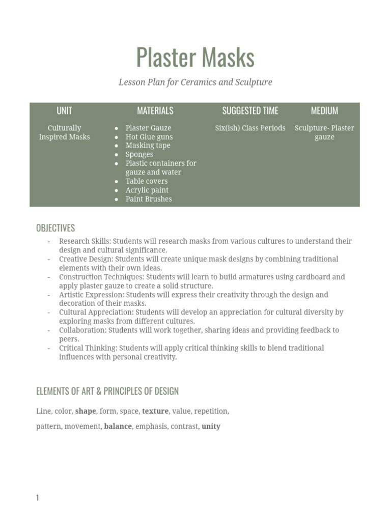 Plaster Mask Lesson Plan - Sculpture Project | PDF | Pattern | Paint