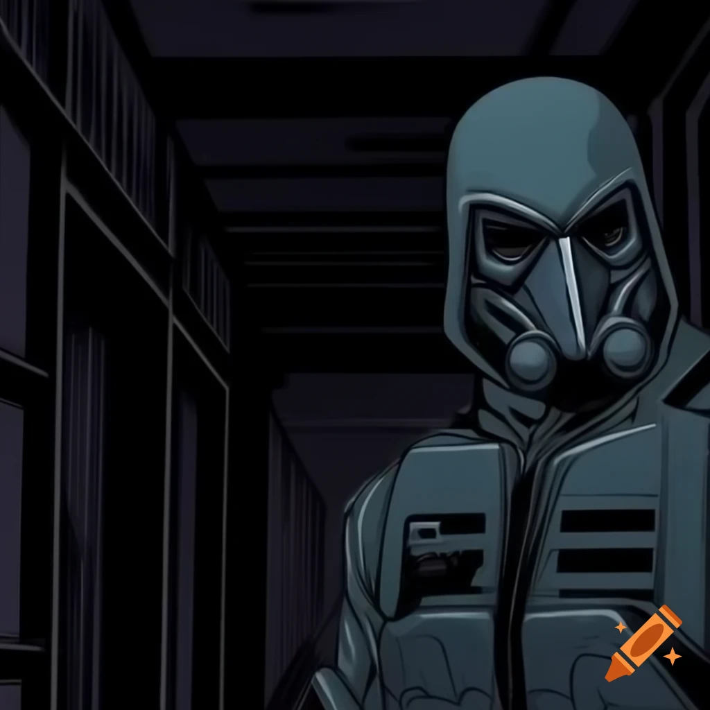 Masked commando in dark corridor, G.I. Joe comic book art style on Craiyon