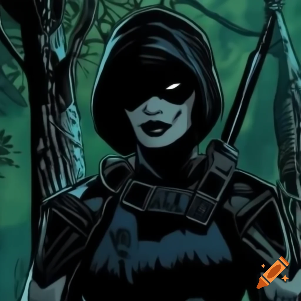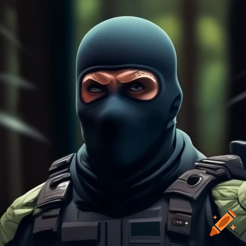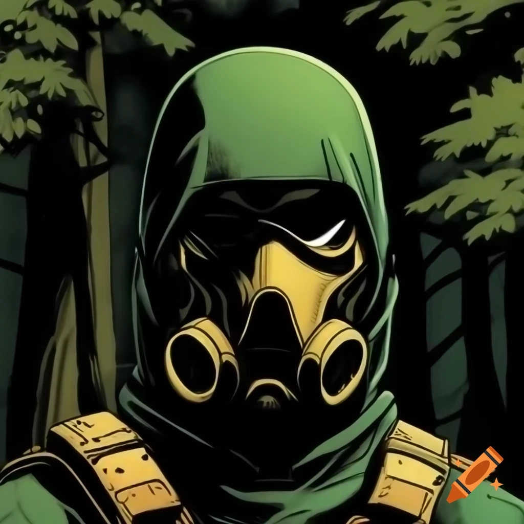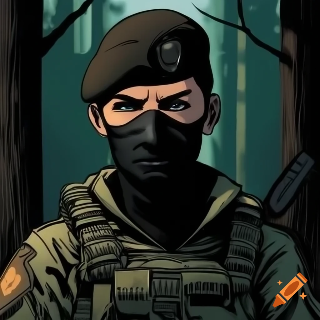 Illustration of masked commando in forest, comic book art style on Craiyon