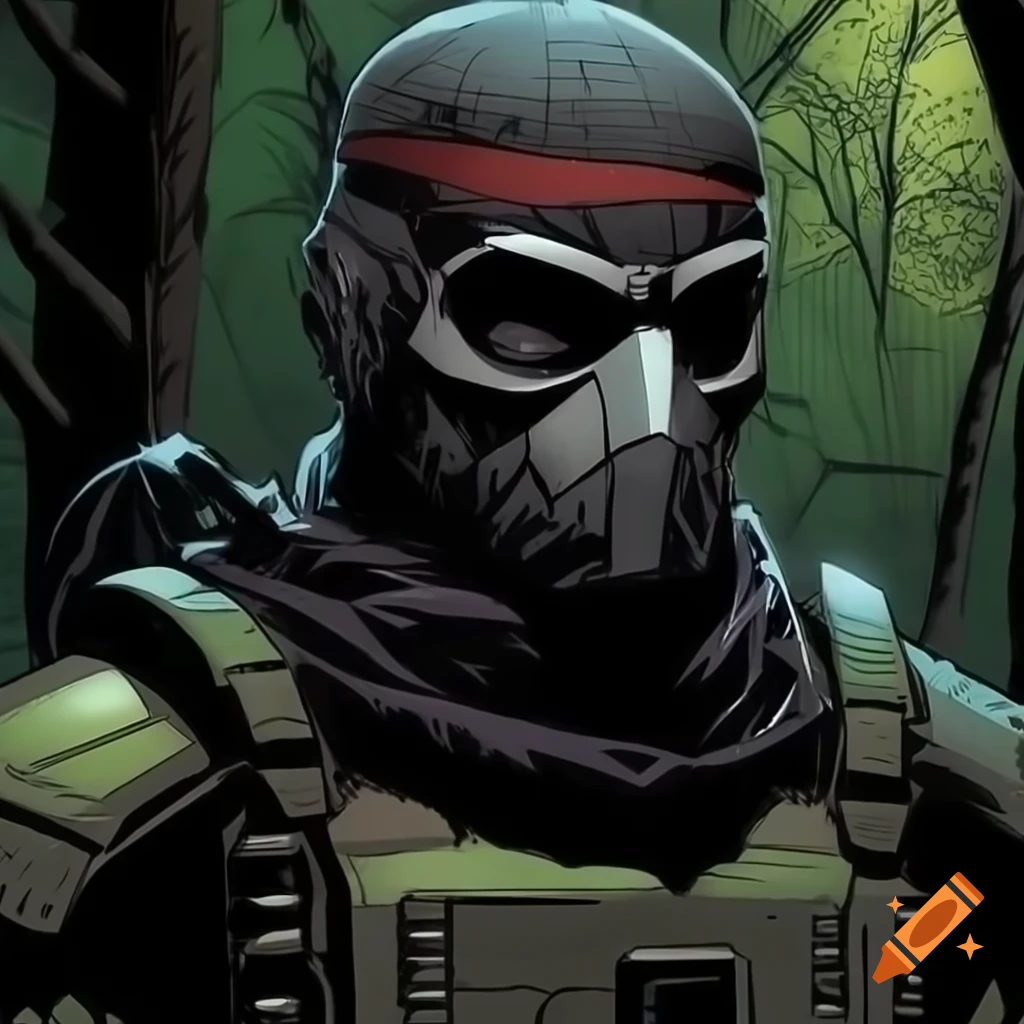 Masked commando in forest, comic book art style by Greg Capullo on Craiyon