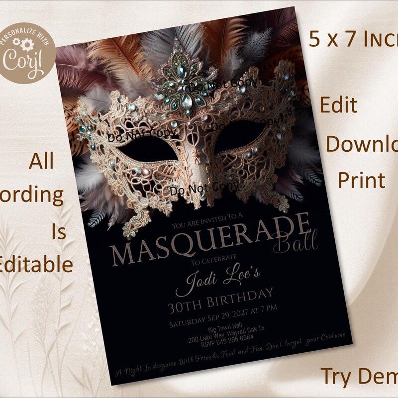 Elegant Masquerade Ball Invitation Template, Masquerade Party Editable ...