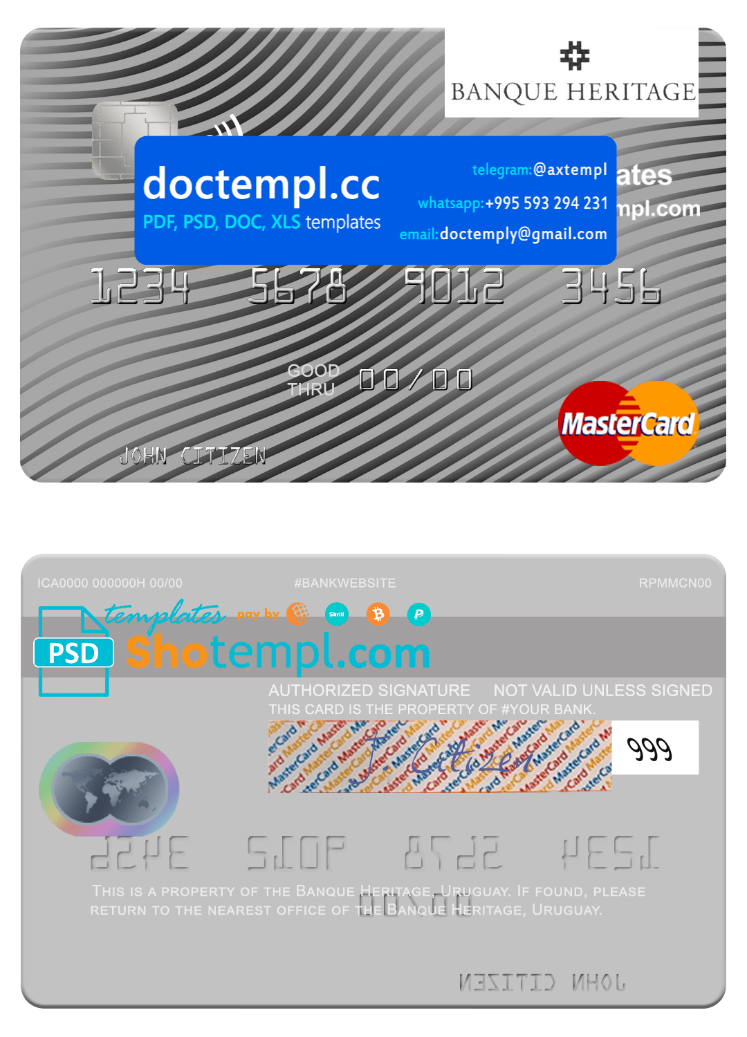 Uruguay Banque Heritage mastercard fully editable template in PSD format