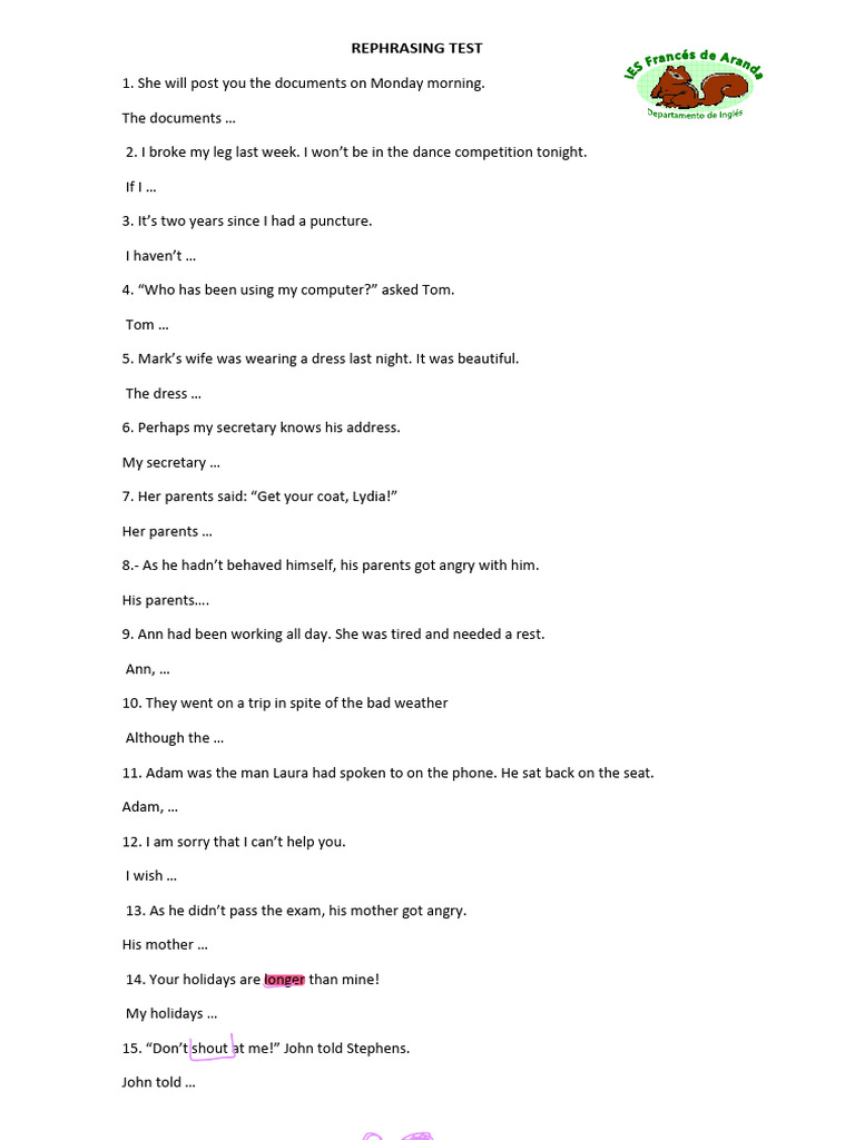 Rephrasing Test with Answers | PDF