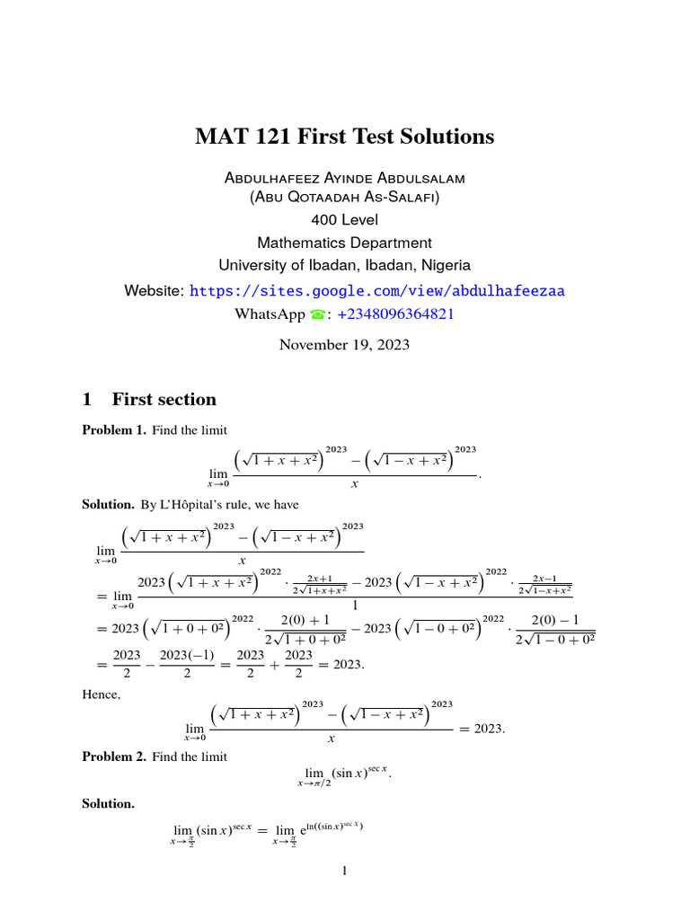 MAT 121 (TEST) 2007-2010 - Mathematics - Studocu