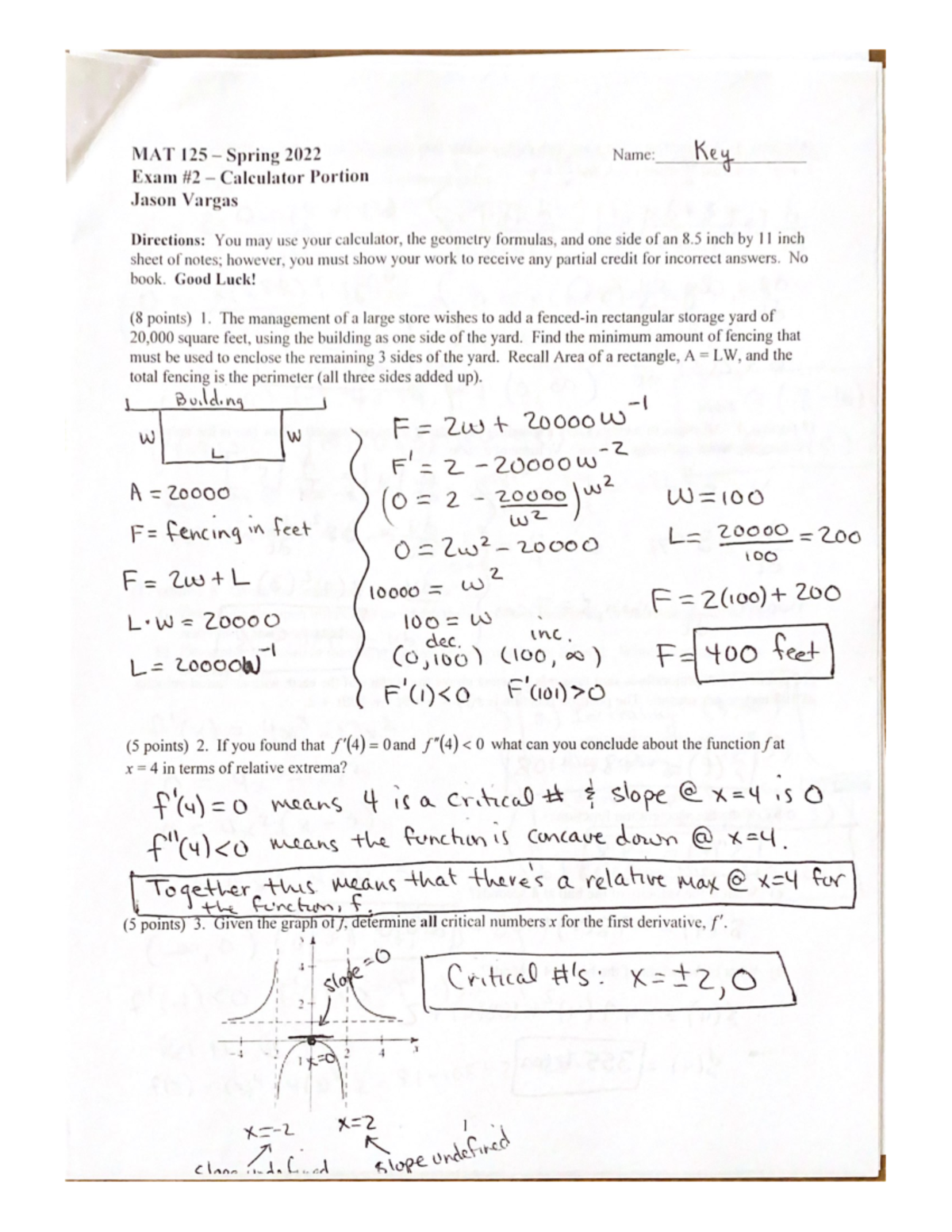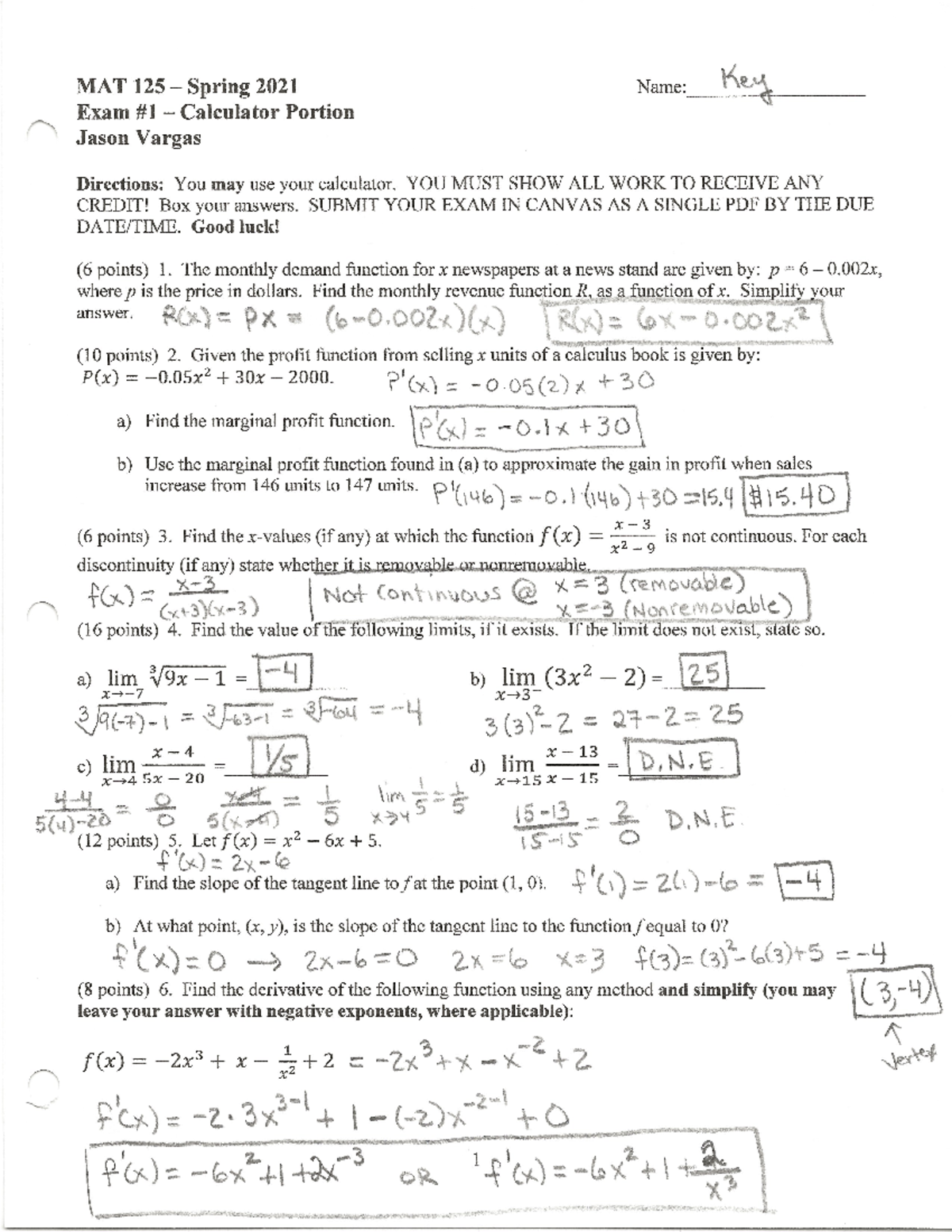 2021 Unit Exam Solutions/Work-through - MAT 125 Spring 2021 Name: Key ...