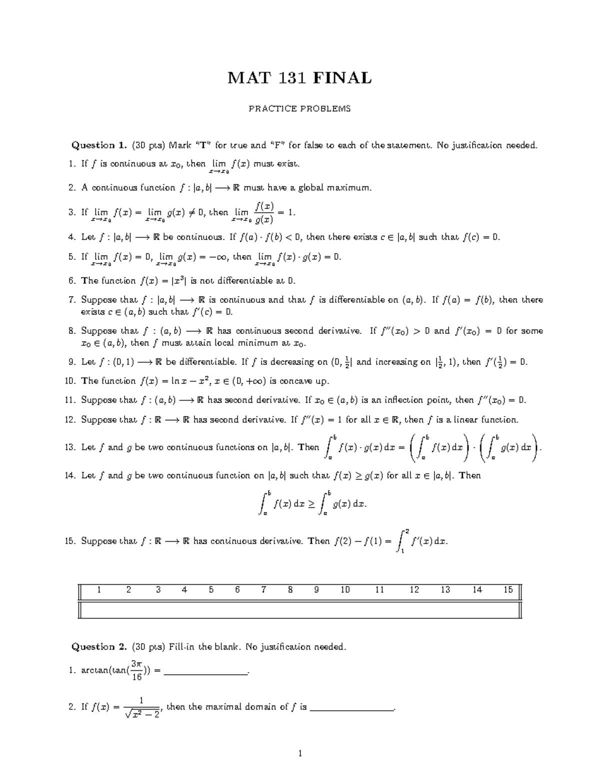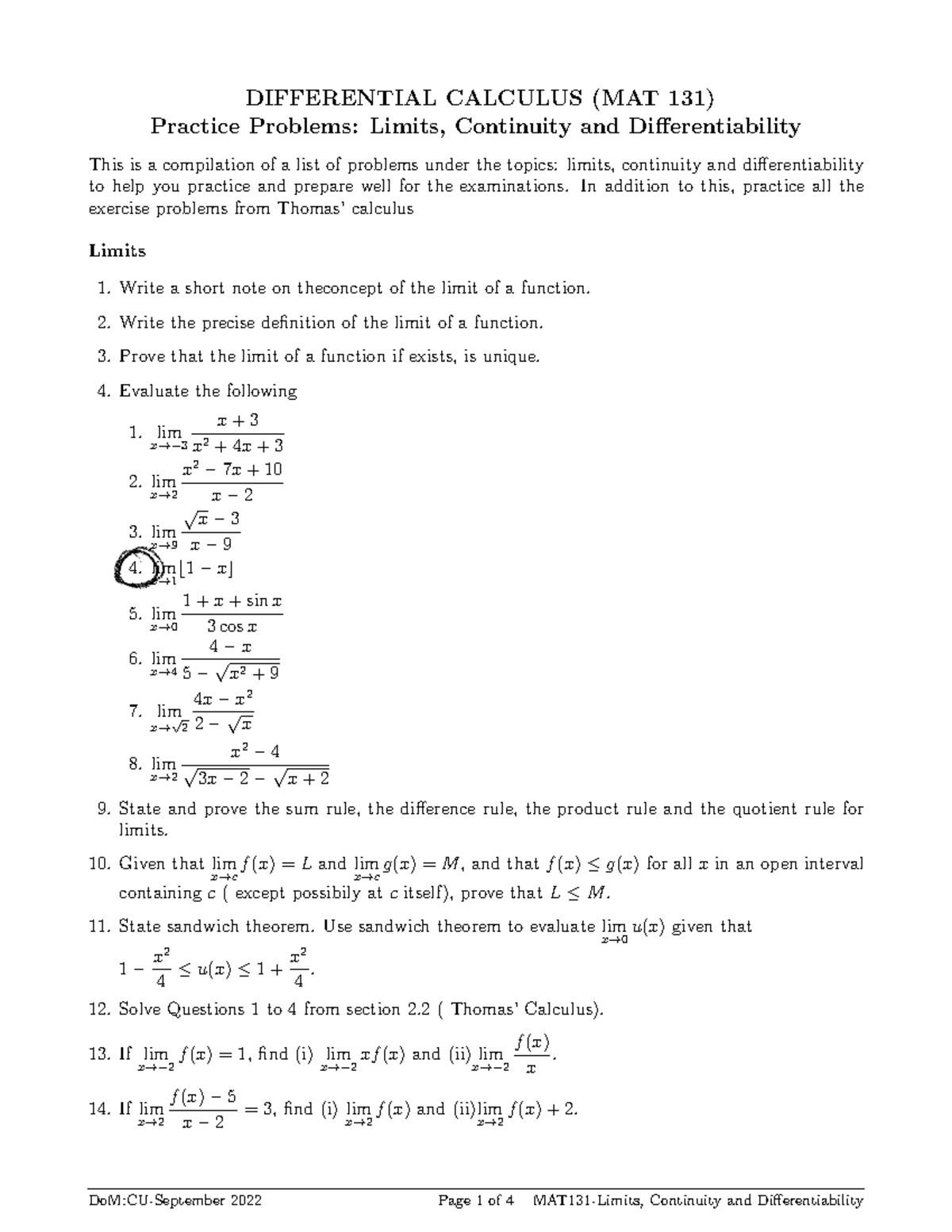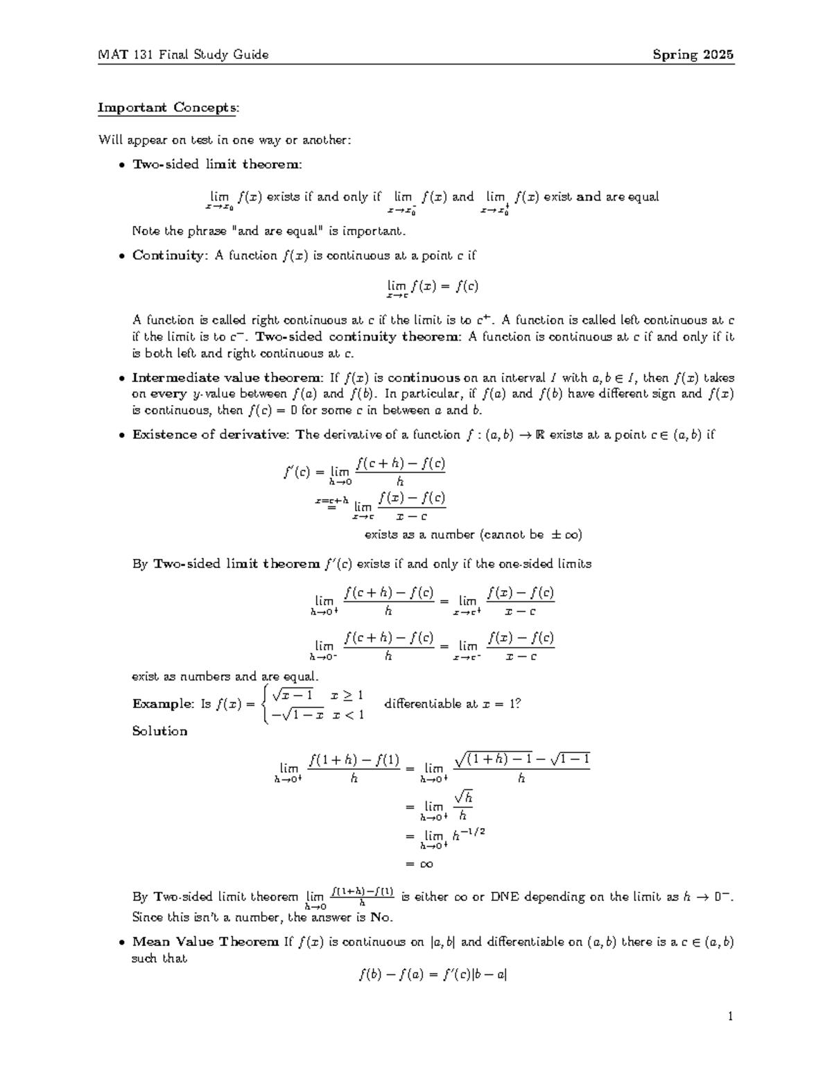 MAT 131 Final Exam Prep: Limits, Continuity & Differentiability ...