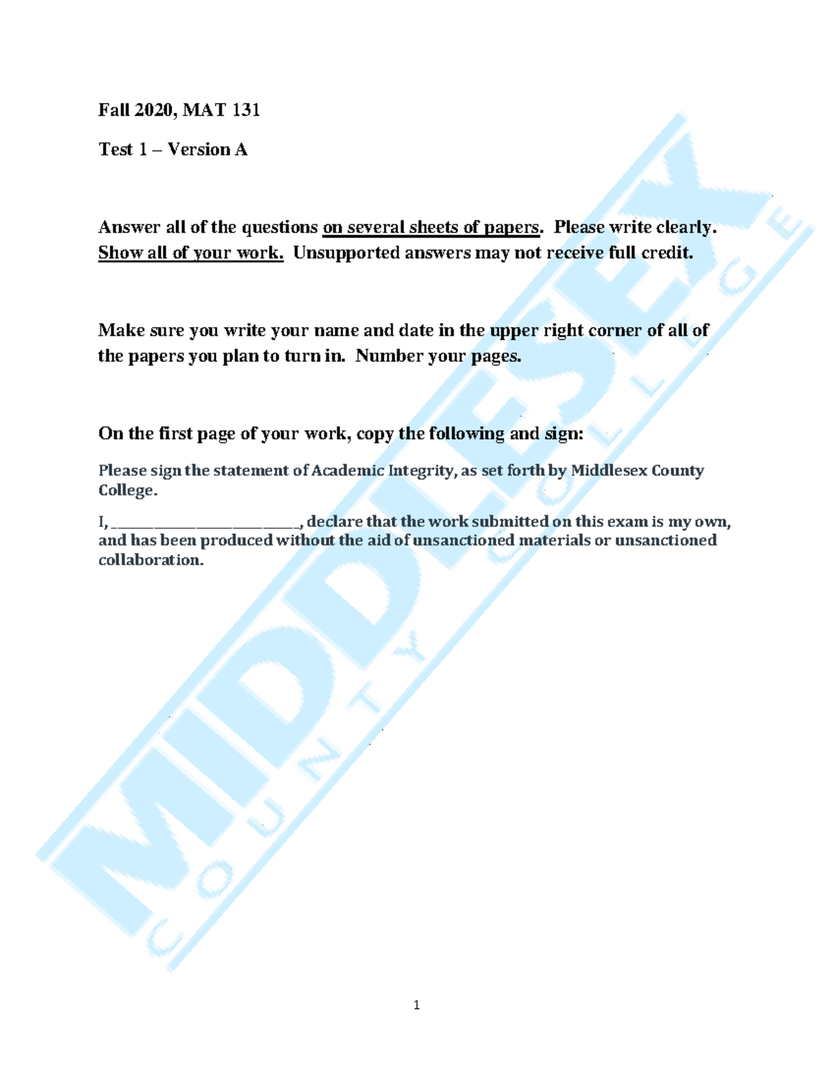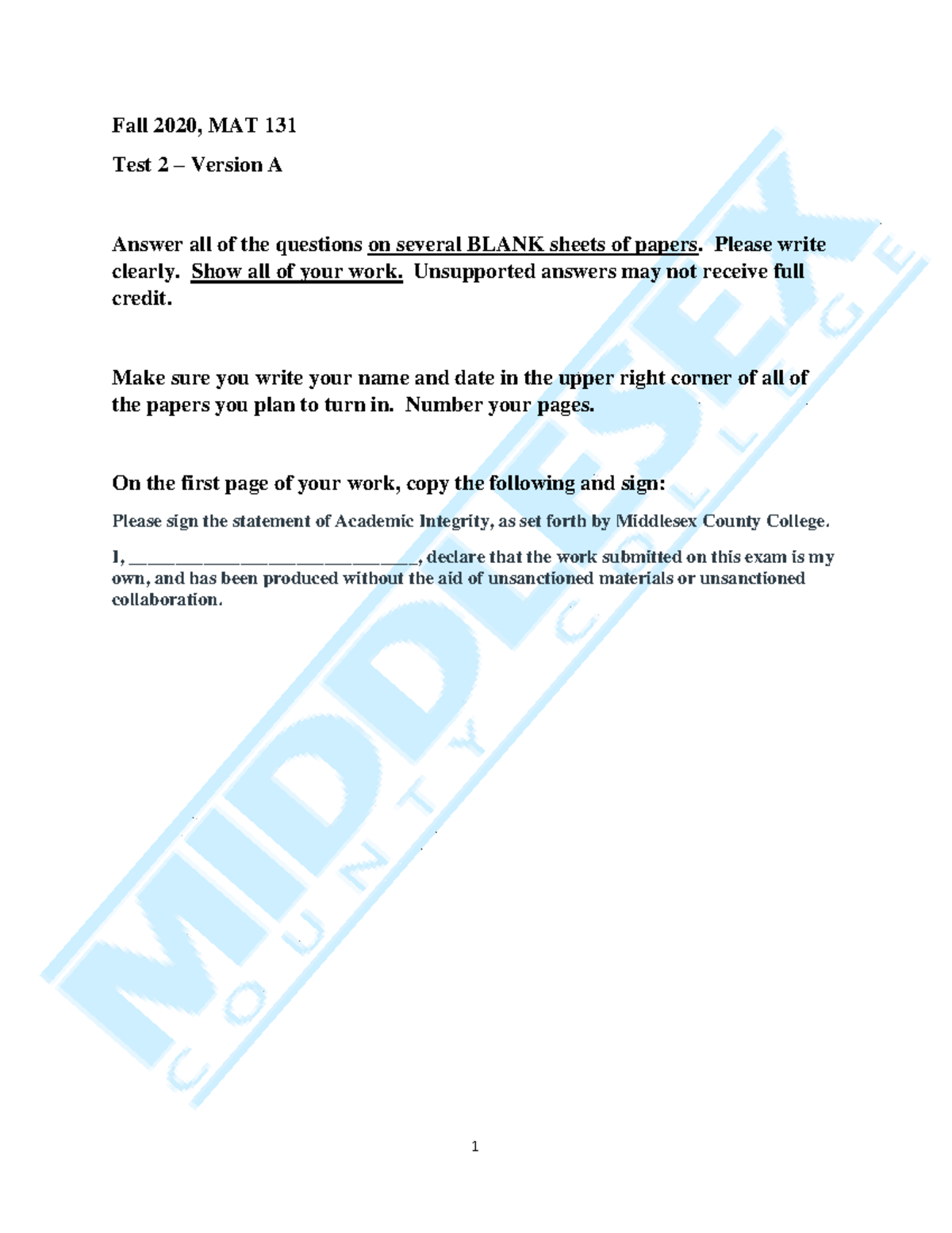 MAT 131 Test 2 Fall 2020, Version A Exam Instructions and Questions ...