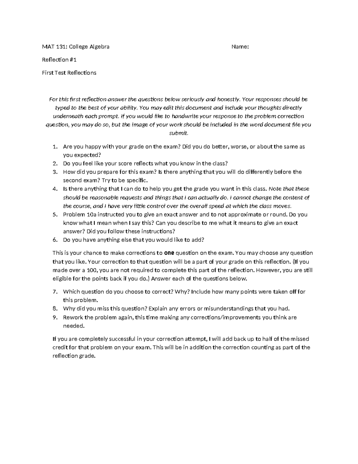 MAT 131: College Algebra - Reflection on First Exam Performance - Studocu