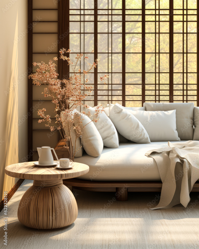Golden-brown steel side table beside a white sofa, sunlight through a ...