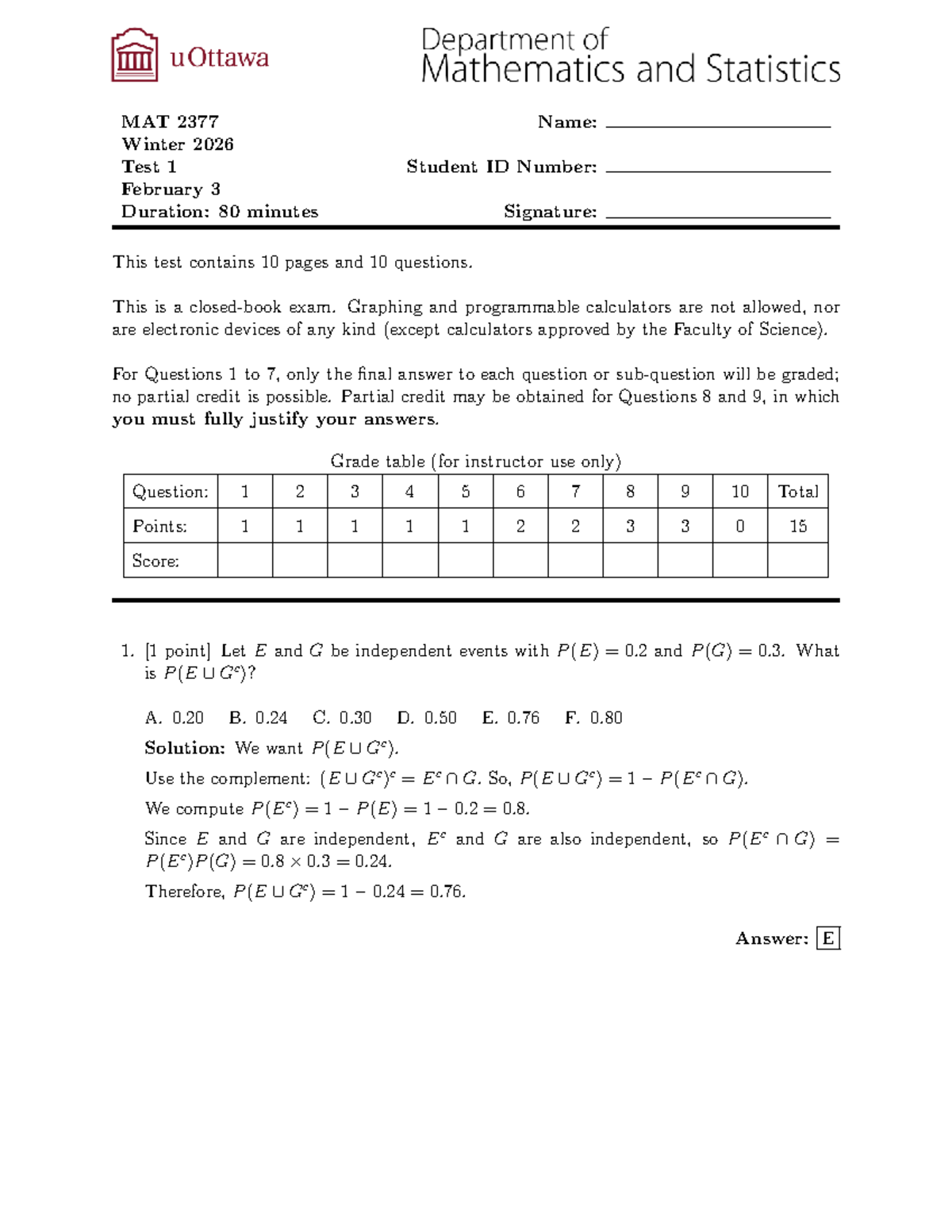 MAT 2377 Winter 2026 Test 1 Solutions and Analysis - Studocu