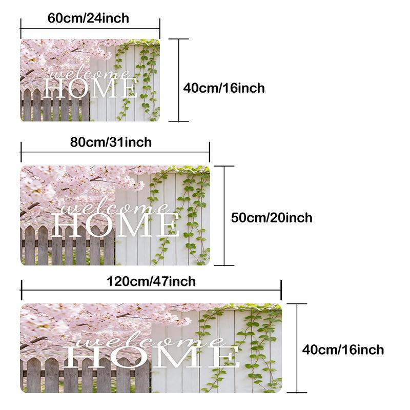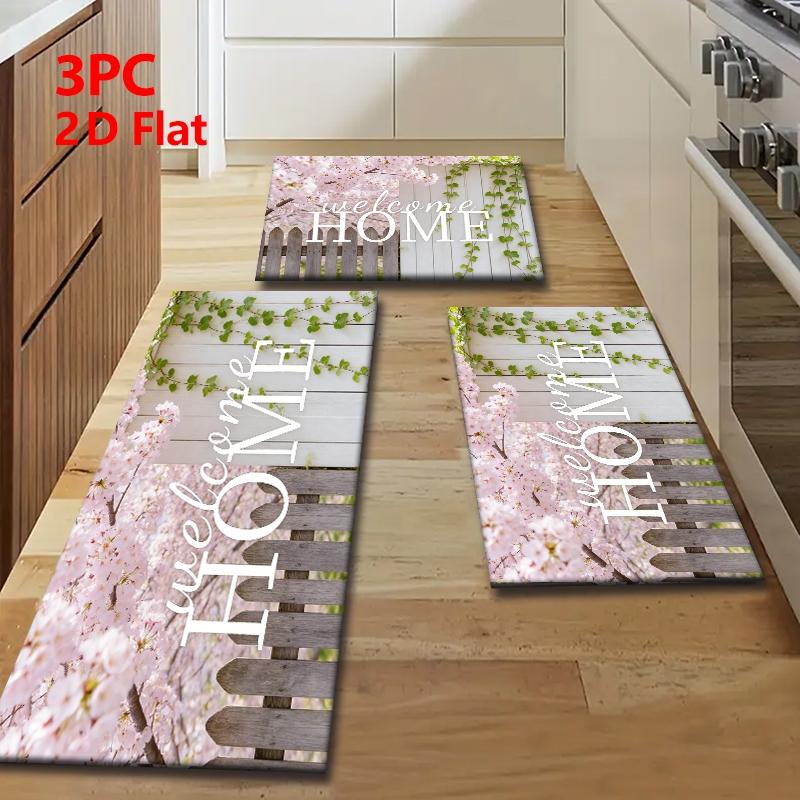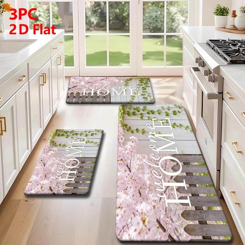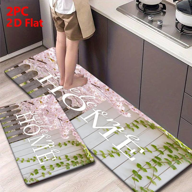 2/3 Piece Flannel Kitchen Mat Set, Faux Wood Fence & Sakura Print, Non ...
