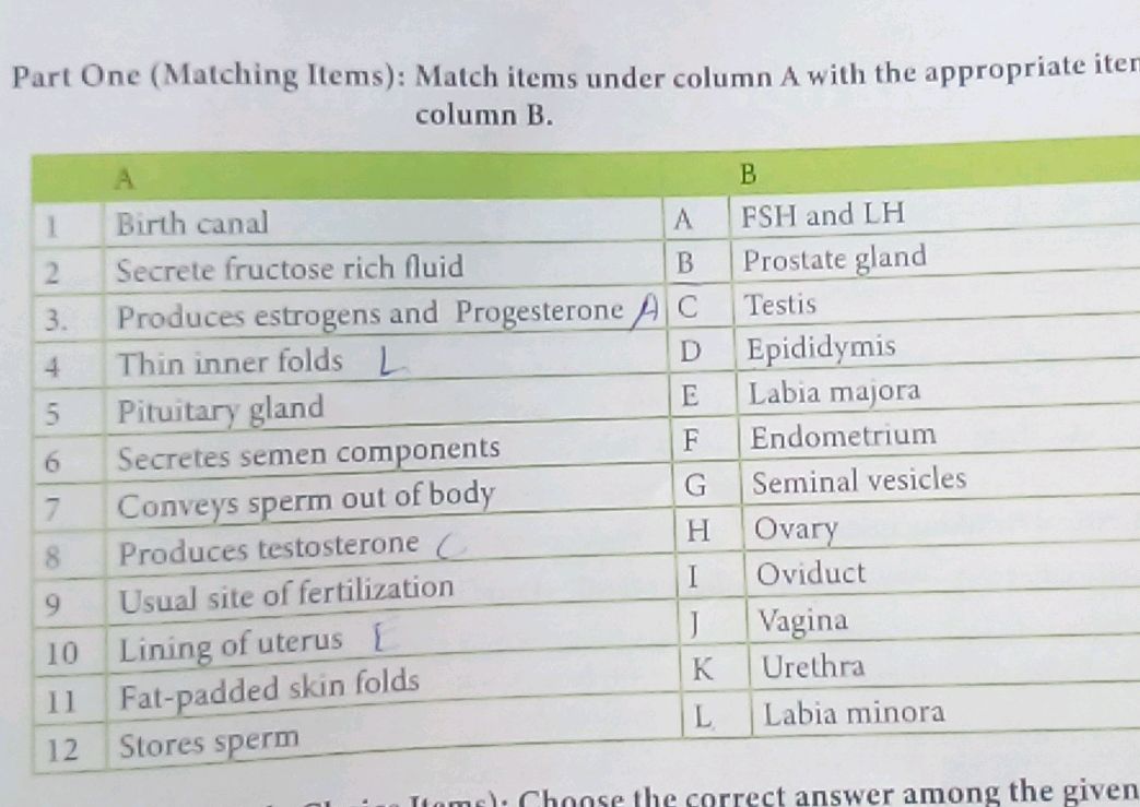 Part One (Matching Items): Match items under | StudyX