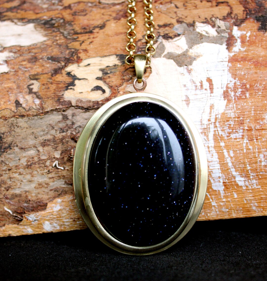 Large Vintage Style Oval Brass Locket With a Blue Goldstone Cabochon on ...