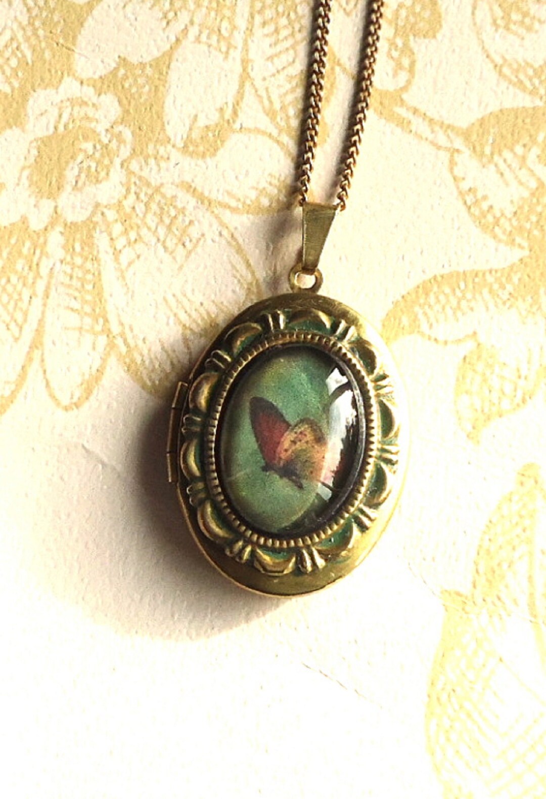 Vintage Style Oval Brass Locket With a Glass Butterfly Cabochon on a ...