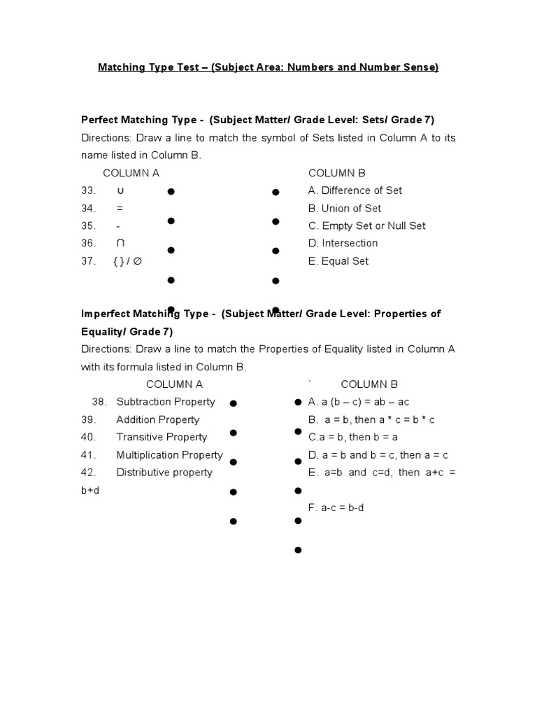 What Is Matching Type Test Example - Free Math Worksheet Printable