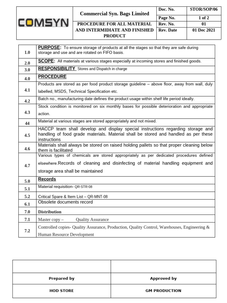 Material Handling and Storage Procedure | PDF | Quality Assurance ...