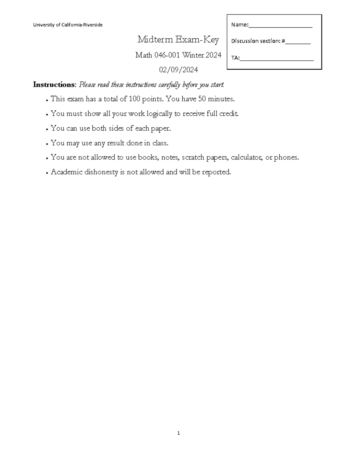 Midterm Exam Math 046-001 Winter 2024 - University of California ...