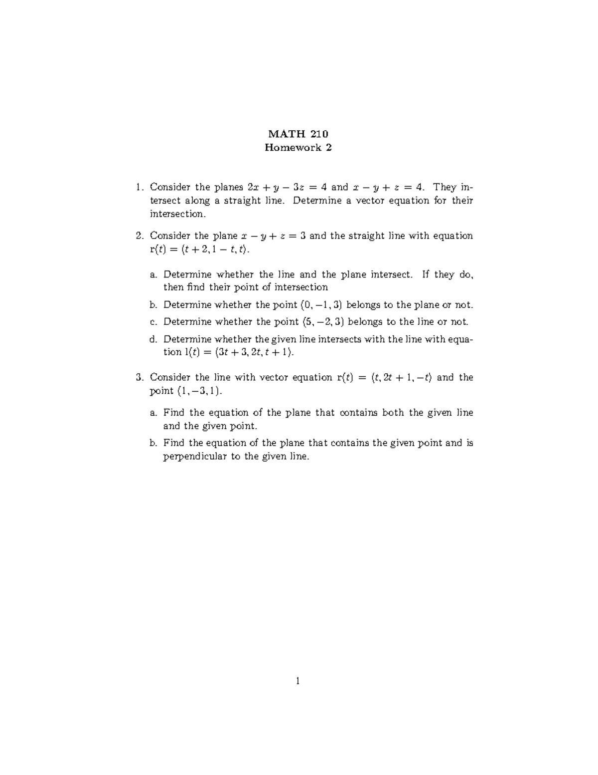 MATH 210 HW 2 2022/23 - MATH 210 Homework 2 Consider the planes 2x + y ...