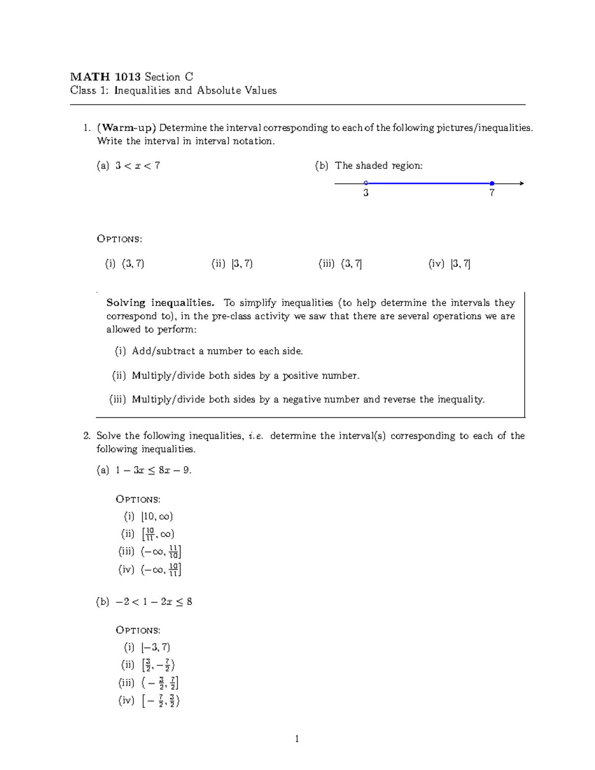 Class 1 Notes C - MATH 1013 Section C Class 1: Inequalities and ...