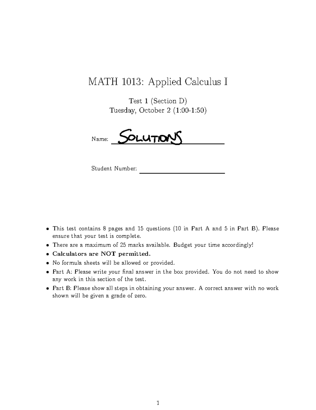 MATH 1013 Test 1 with solutions - MATH 1013 Applied Calculus Section E ...