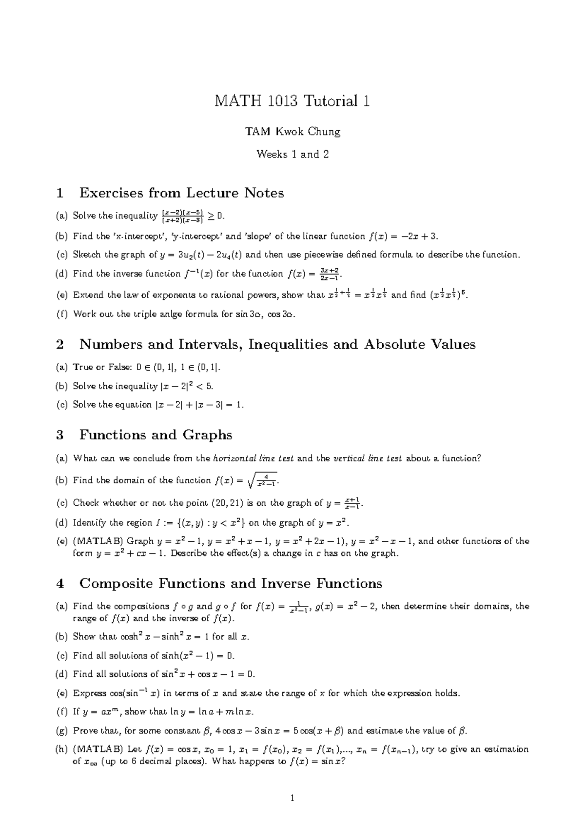 MATH1013 Tutorial 1 - MATH 1013 Tutorial 1 TAM Kwok Chung Weeks 1 and 2 ...
