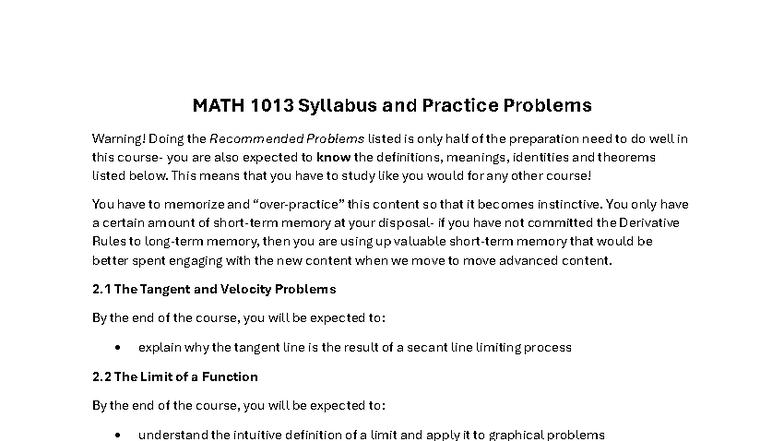 MATH 1013 Practice Problems and Syllabus Overview - Studocu