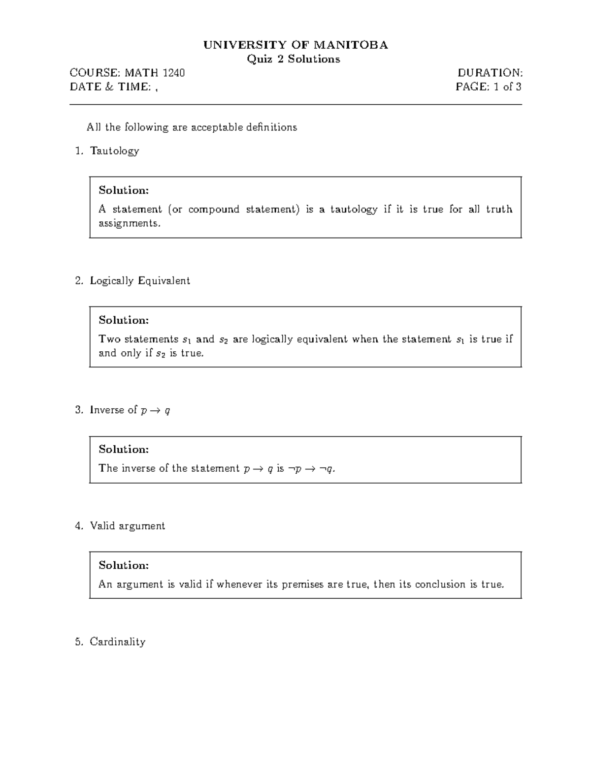 MATH1240 Quiz 1 Solutions - UNIVERSITY OF MANITOBA Quiz 1 Solutions ...