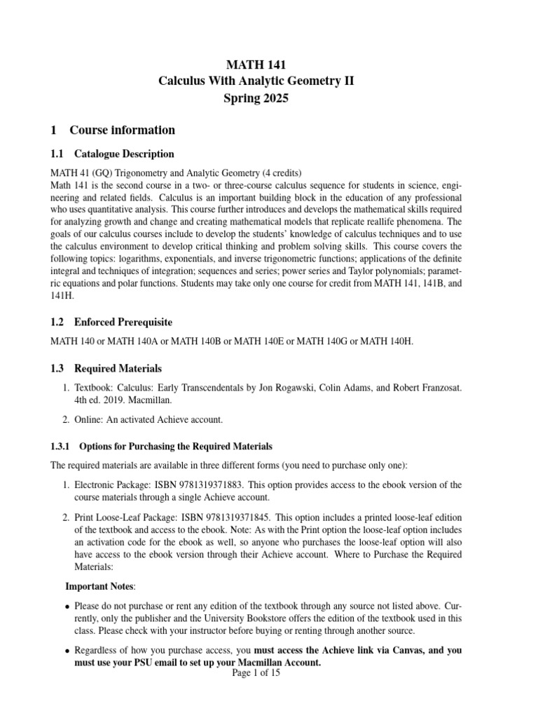 MATH 141 Calculus I Syllabus and Course Overview - Studocu