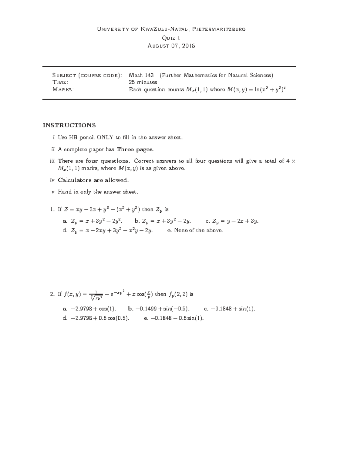 Math 143 Quiz 1 - Further Mathematics for Natural Sciences - Studocu