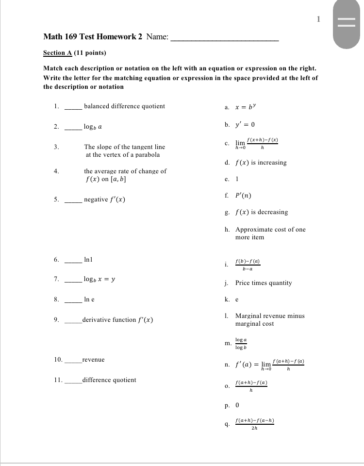 Solved 1Math 169 Test Homework 2 Name:Section A (11 | Chegg.com