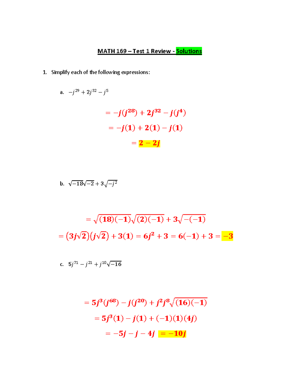 MATH 169 Test 1 Review - Solutions - MATH 169 – Test 1 Review ...