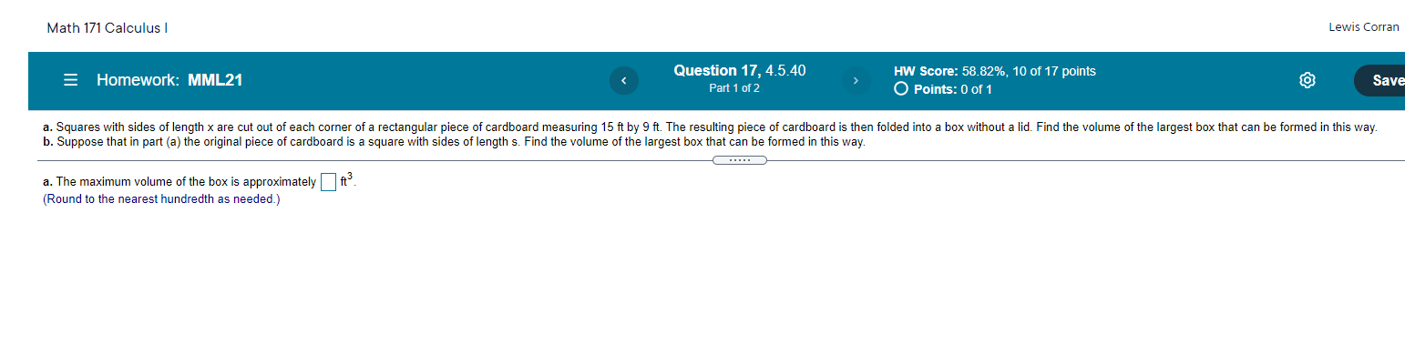 Solved Math 171 Calculus Lewis Corran Homework: MML21 | Chegg.com