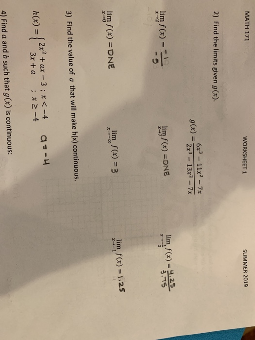 Solved MATH 171 WORKSHEET 1 SUMMER 2019 2) Find the limits | Chegg.com