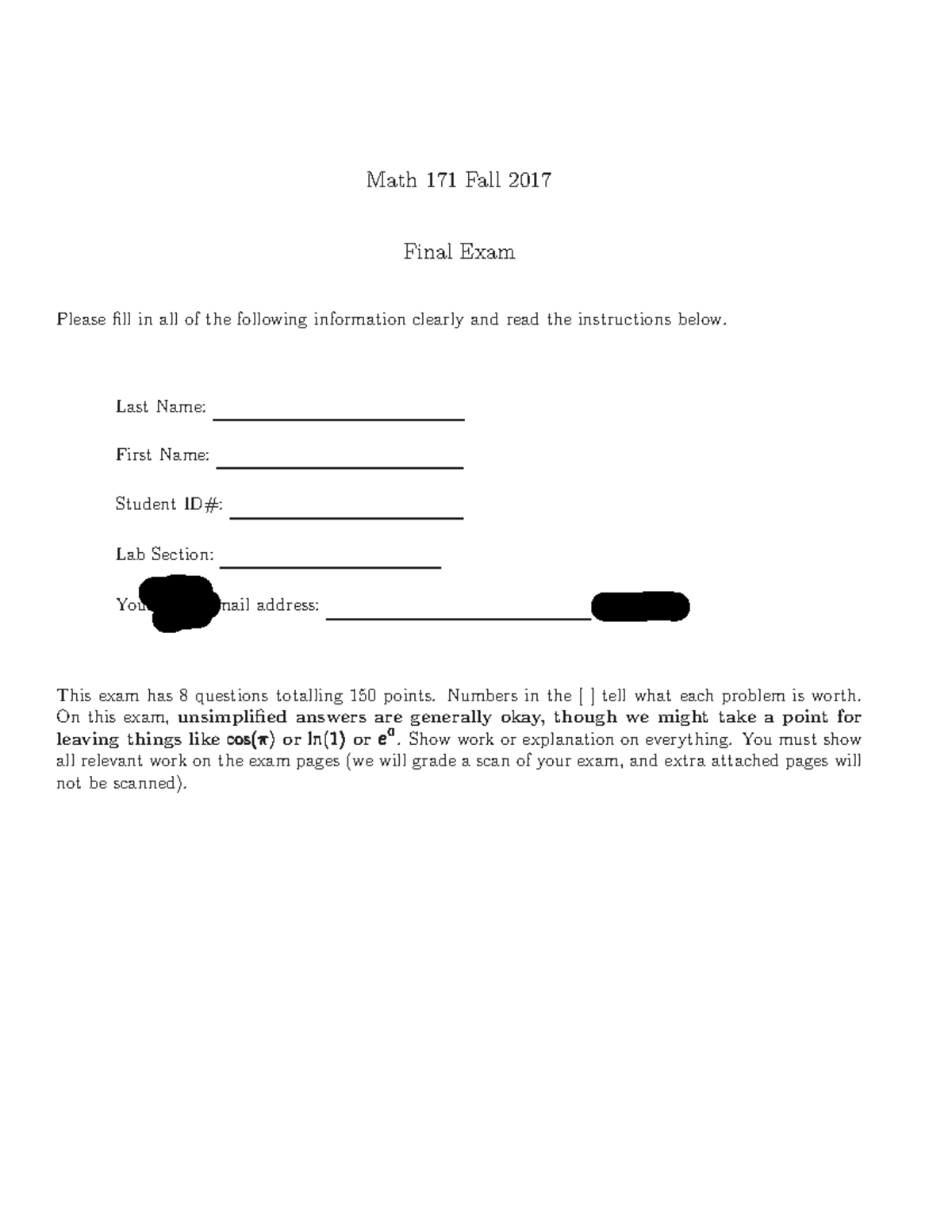 Math 171 Final Exam Questions & Guidelines - Fall 2017 - Studocu