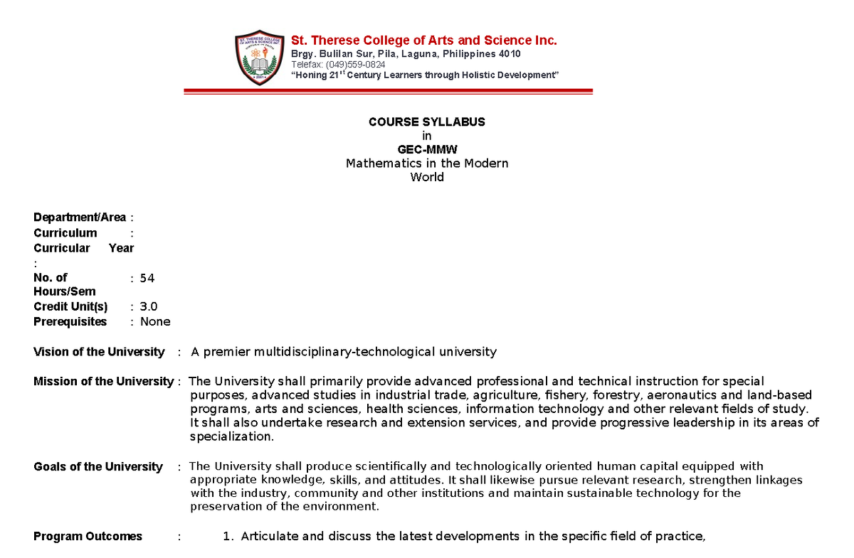 Mathematics IN THE Modern World - St. Therese College of Arts and ...