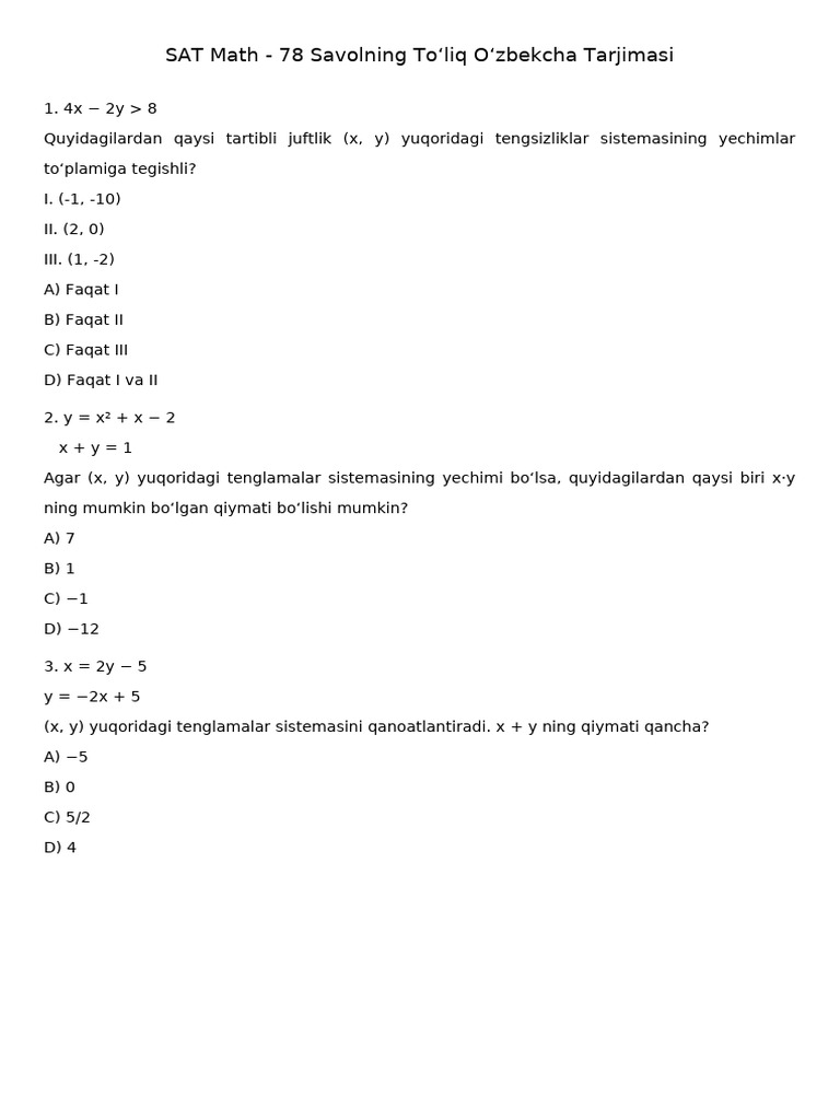 SAT Math 78 Savol Uzbek Tarjima Demo | PDF