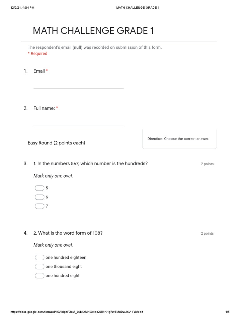 Math Challenge Grade 1 - Google Forms | PDF