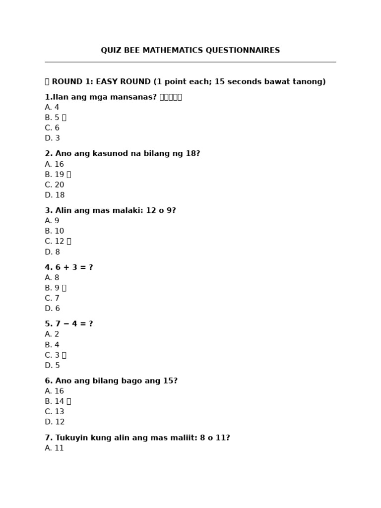 Math Quiz Bee Questionnaires | PDF
