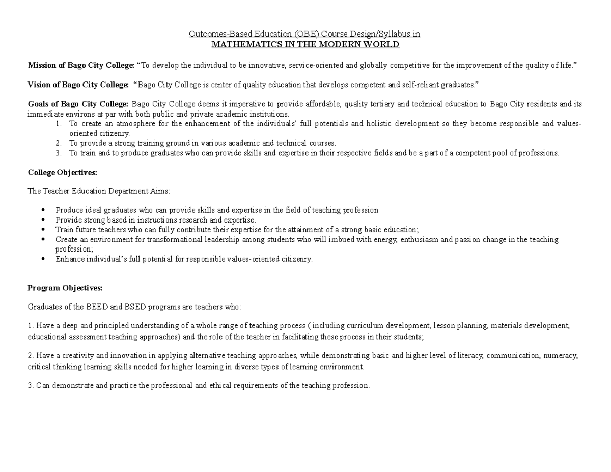 Course Design Syllabus in Mathematics - Outcomes-Based Education (OBE ...