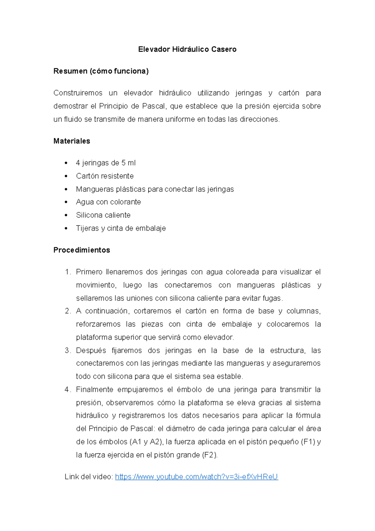 Elevador Hidráulico Casero: Resumen y Principio de Pascal - Studocu