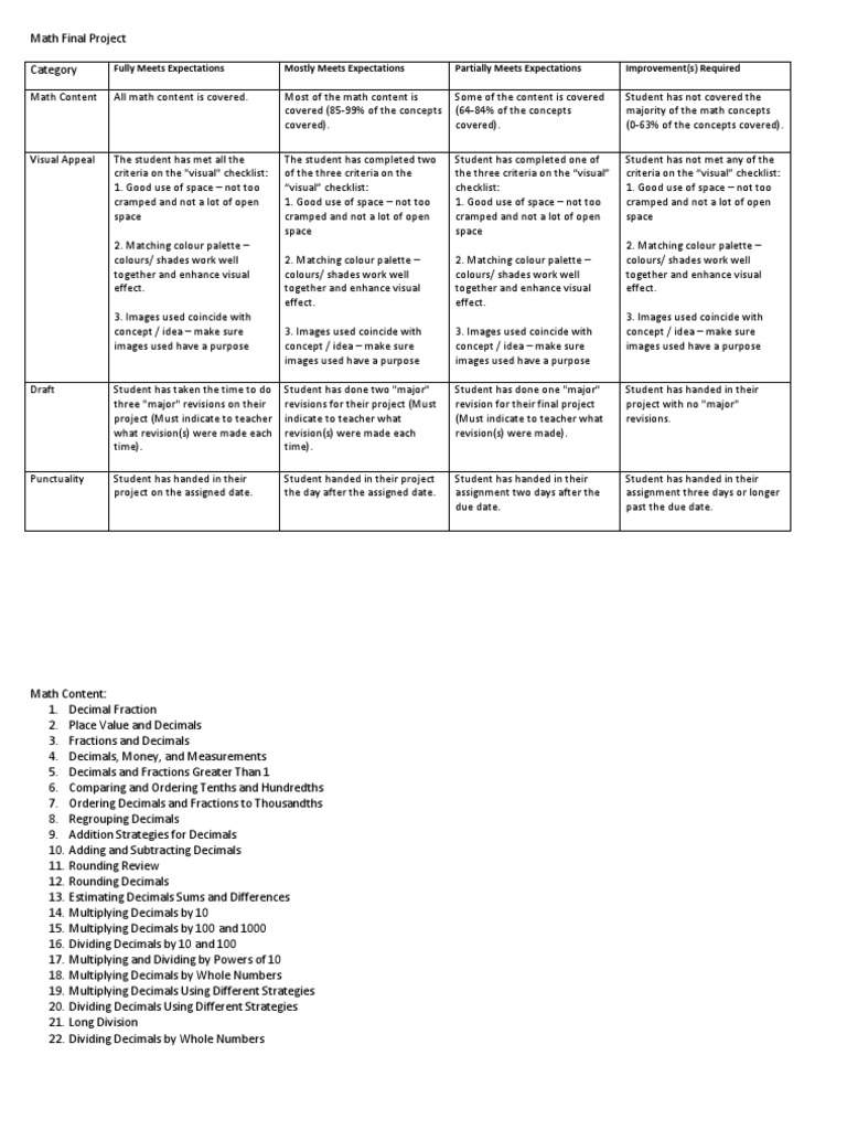Math Final Project Rubric | PDF | Decimal | Fraction (Mathematics)