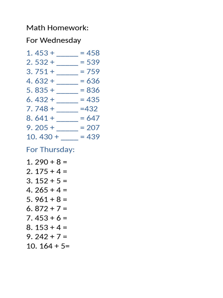 Math Homework Grade 3-Simple Addition and Subtraction.: Due Date: Day ...