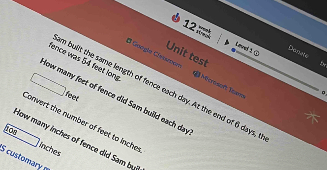 Solved: week streak Level 1 ① Donate Unit test fence was 54 feet long ...