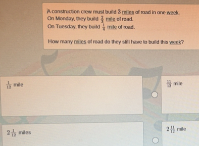 A construction crew must build 4 miles of road in one week. On Monday ...