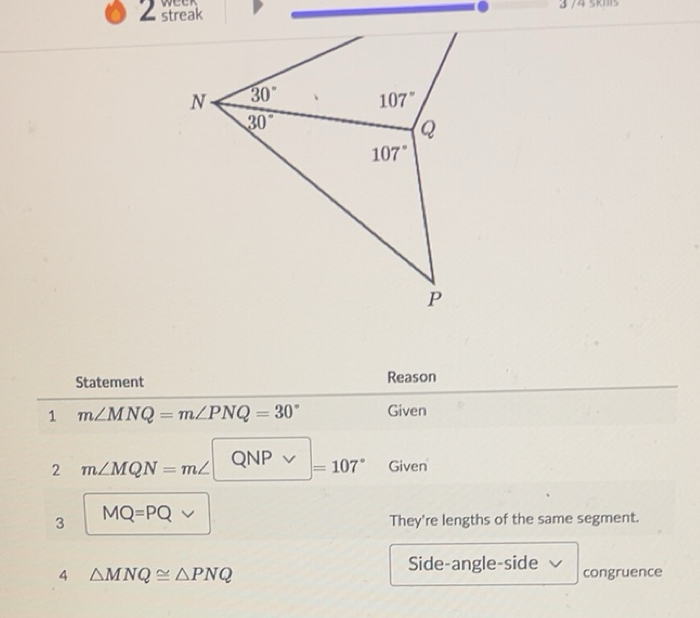 Solved: week 2 3 74 škmš Statement Reason 1 m∠ MNQ=m∠ PNQ=30° Given 2 m ...