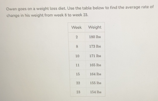 Solved: Owen goes on a weight loss diet. Use the table below to find ...