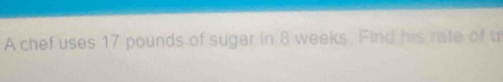 Solved: A chef uses 17 pounds of sugar in 8 weeks. Find his rate of u ...
