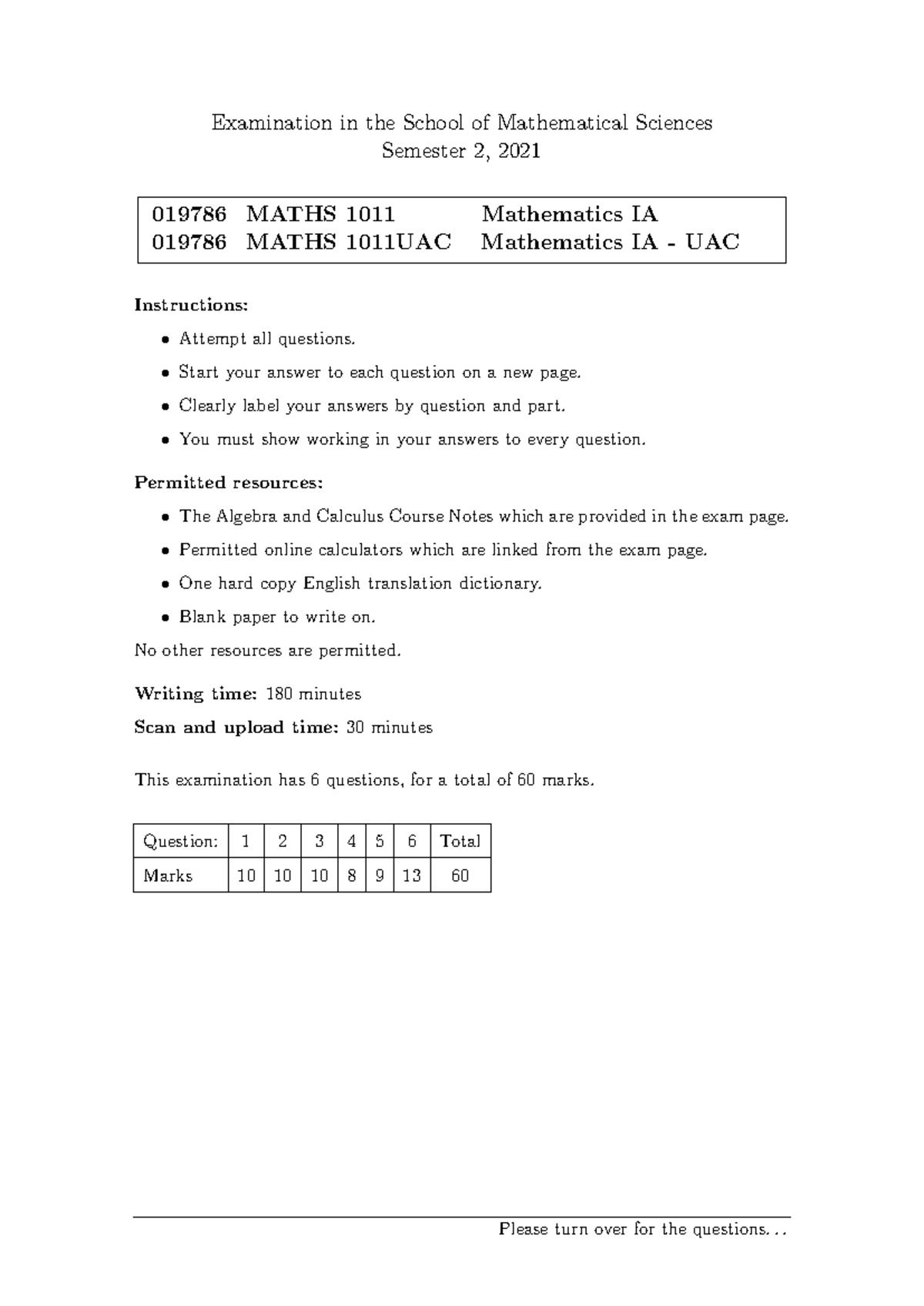 Maths IA Exam S2 2021 - Sample Exam - Examination in the School of ...