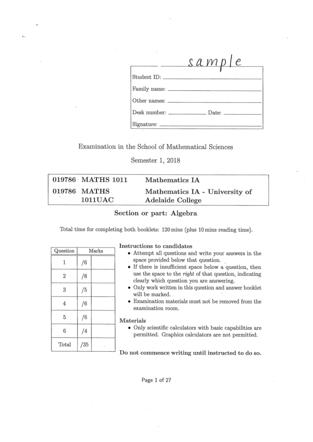 University of Adelaide - IA Sample Test - [PRINT] Mathematics IA (2023 ...
