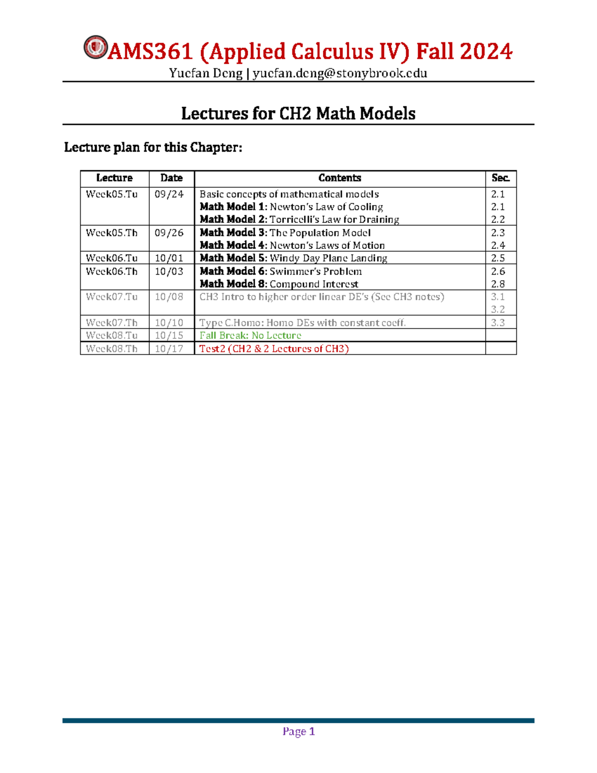Lecture Notes for AMS361 (Applied Calculus IV): Mathematical Models ...